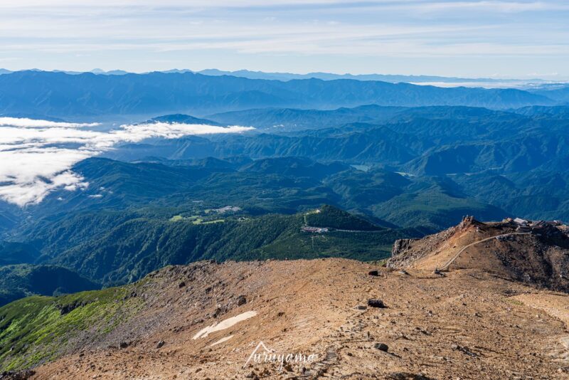 ③開田口ルート:開田口登山口(4号目)から二の池山荘を経て剣ヶ峰を目指すコース。他のルートよりも距離が長く日帰りは難しい(1泊2日を推奨)ですが、御嶽山の裾野の広がりを感じられるルート。
